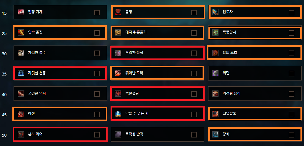 방어 전사를 위한 특성 선택 (주 : 빨강 / 선택 : 주황)